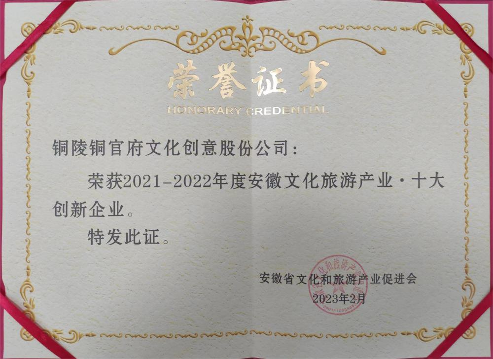 日前,由安徽省文化和旅游產(chǎn)業(yè)促進(jìn)會(省文促會)主辦的第二屆安徽文化旅游產(chǎn)業(yè)2021-2022年度頒獎(jiǎng)盛典暨新春聯(lián)誼會活動在合肥舉行,2021-2022 年度“七個(gè)十”榜單公布。銅陵銅官府文化創(chuàng)意股份公司榮獲“2021-2022年度安徽文化旅游產(chǎn)業(yè) · 十大創(chuàng)新企業(yè)”,公司創(chuàng)始人趙敏榮獲“2021-2022年度安徽文化旅游產(chǎn)業(yè) · 十大榜樣人物”。