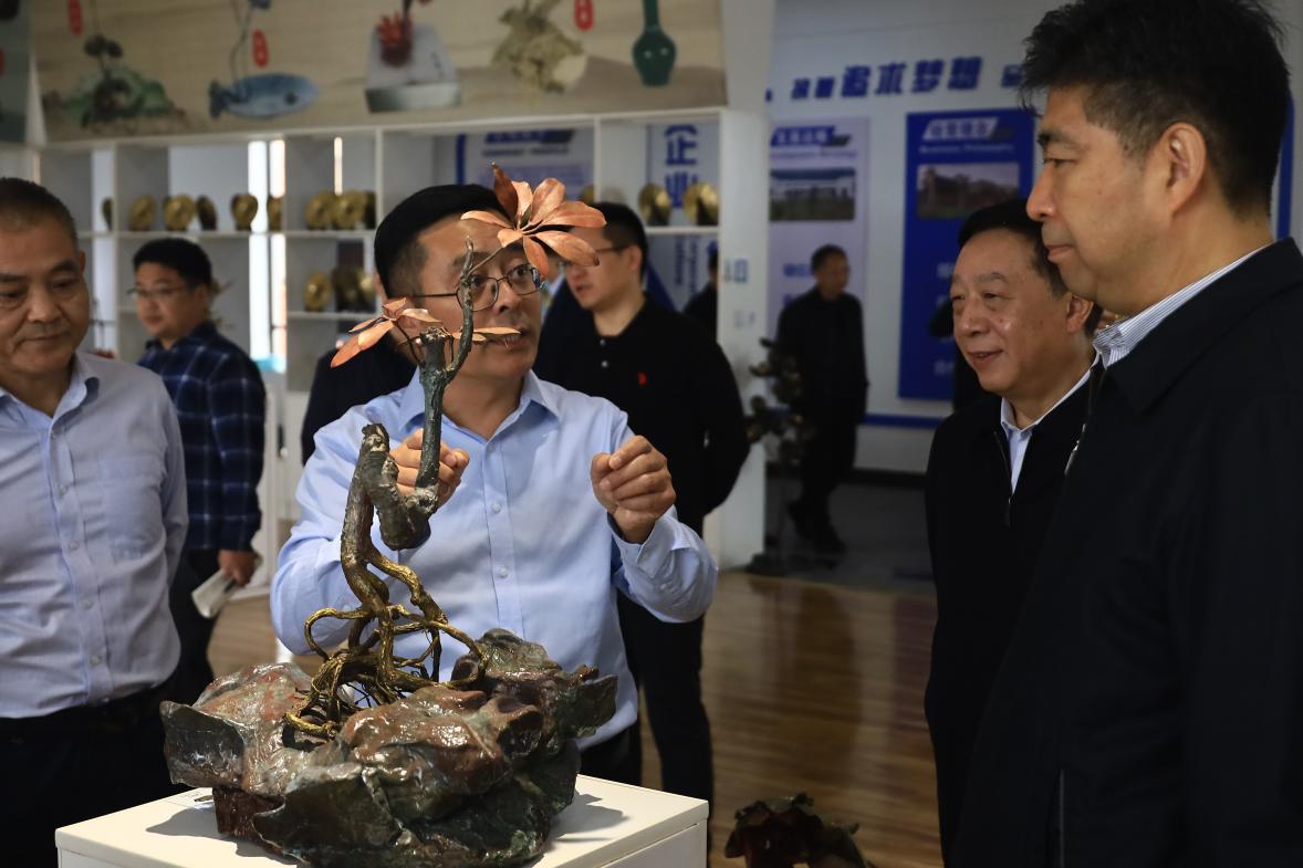 公司負責人郭飛陪同參觀并匯報了企業(yè)生產(chǎn)經(jīng)營、市場銷售、非遺技藝傳承等情況。調(diào)研組深入車間詳細了解銅工藝品制作技藝、工藝傳承創(chuàng)新,曲福田副主任對我公司把傳統(tǒng)工藝和現(xiàn)代創(chuàng)意有機結合做法給予充分肯定,并就優(yōu)化產(chǎn)品結構、提升產(chǎn)品競爭力與公司負責人進行交流探討,他希望銅官府進一步強化品牌培育,用匠心延續(xù)銅工藝的“金”字招牌。